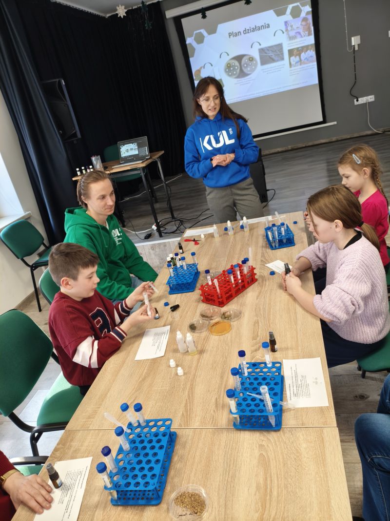 W dniu 20.02.2026 r. odbyły się warsztaty edukacyjne zorganizowane przez członków Koła Naukowego Biotechnologii KUL w Bibliotece Publicznej w Przewodowie oraz w Centrum Kulturalno-Konferencyjnym w Dołhobyczowie. Wydarzenie skierowane było zarówno do dzieci, jak i seniorów, a jego celem było popularyzowanie wiedzy z zakresu biotechnologii oraz promowanie postaw prozdrowotnych i proekologicznych.