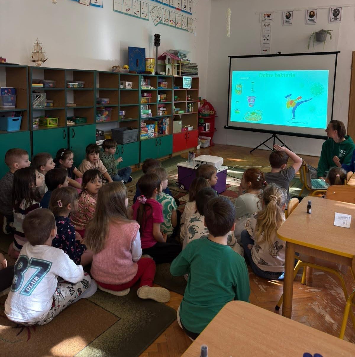 Podczas spotkania w przystępny i ciekawy sposób opowiedzieliśmy dzieciom o tym, czym są bakterie i gdzie można je spotkać, czym są antybiotyki oraz dlaczego ich odpowiedzialne stosowanie jest tak ważne. Wyjaśniliśmy także, czym jest antybiotykooporność i jak wpływa na zdrowie, a także jak skutecznie chronić się przed bakteriami poprzez codzienną higienę.