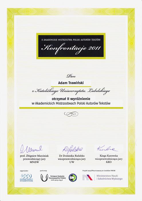 Jednym z laureatów II Akademickich Mistrzostw Polski Autorów Tekstów "Konfrontacje 2011" został mgr Adam Trawiński, zdobywając II wyróżnienie (zobacz dyplom). Zadaniem uczestnika konkursu było przedstawienie autorskiej wizji organizacji studiów, uczelni lub systemu szkolnictwa, która jego zdaniem jest najbardziej pożądana z punktu widzenia celów indywidualnych lub ogólnospołecznych. Należy też dodać, że jest to już drugi tytuł Adama - w zeszłorocznej edycji też był jednym z wyróżnionych. Gratulujemy ponownie!