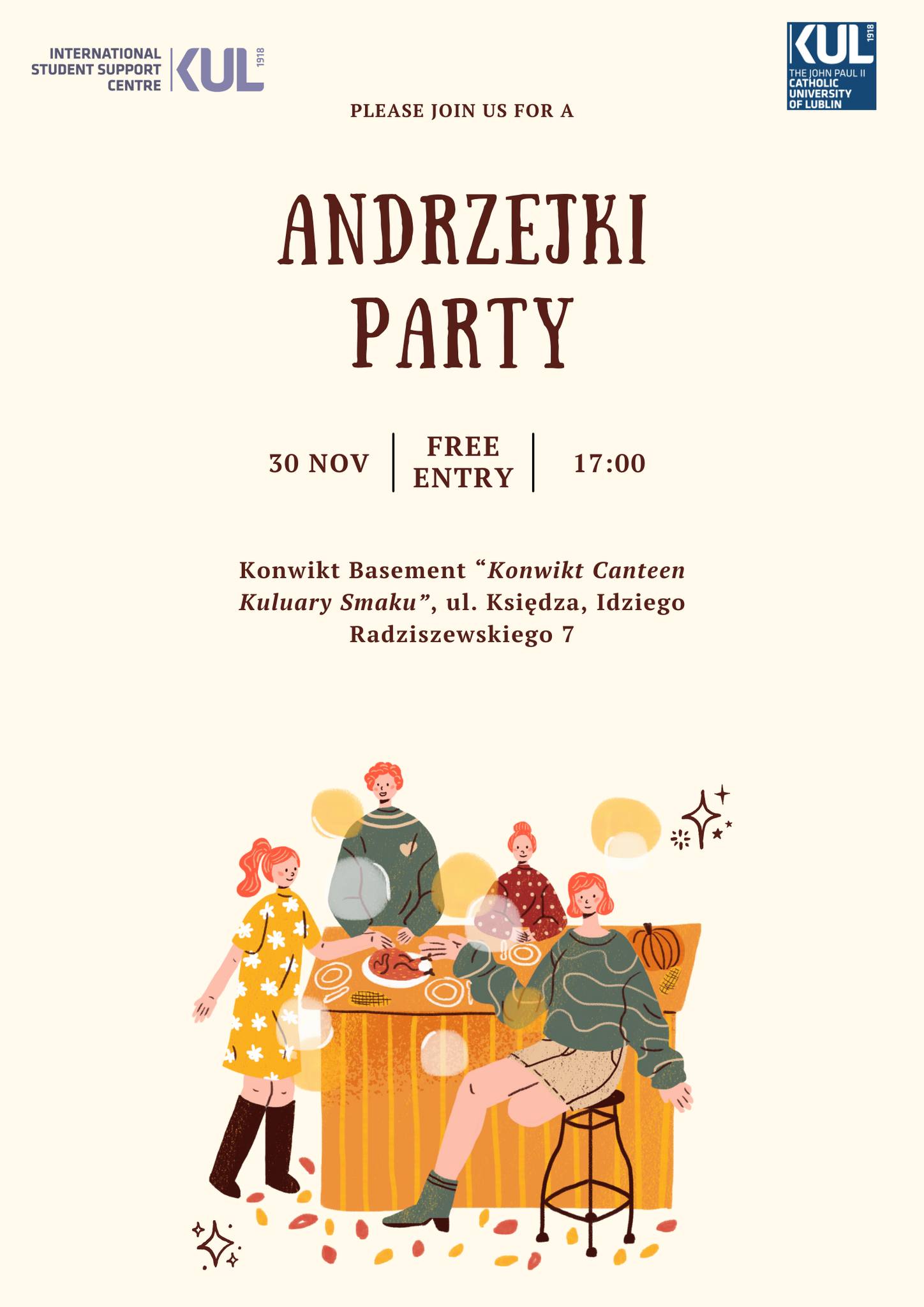 The International Relations Office and the Romance Studies Scientific Circle invite KUL international students and all who are interested to discover the history of St. Andrew's Day, on 30 November! It will be an evening filled with laughter, delicious food and music. Participants will explore Polish traditions through engaging and fun activities. This event will be held in three languages: English, Polish and French. This is a great opportunity to network with other students, embrace the cultural heritage and create lasting memories together. The organisers look forward to meeting you at this culturally enriching event.