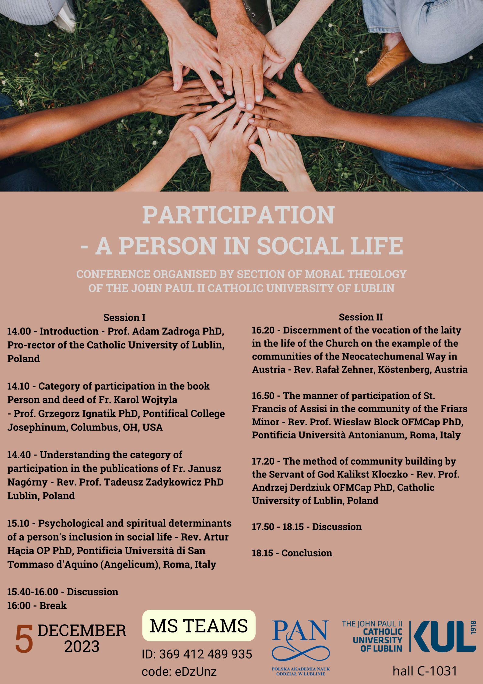 The Section of Moral Theology of the John Paul II Catholic University of Lublin invites to the symposium "Participation - A Person in Social Life", which will be held on 5 December 2023 in room C-1031 of the John Paul II College.