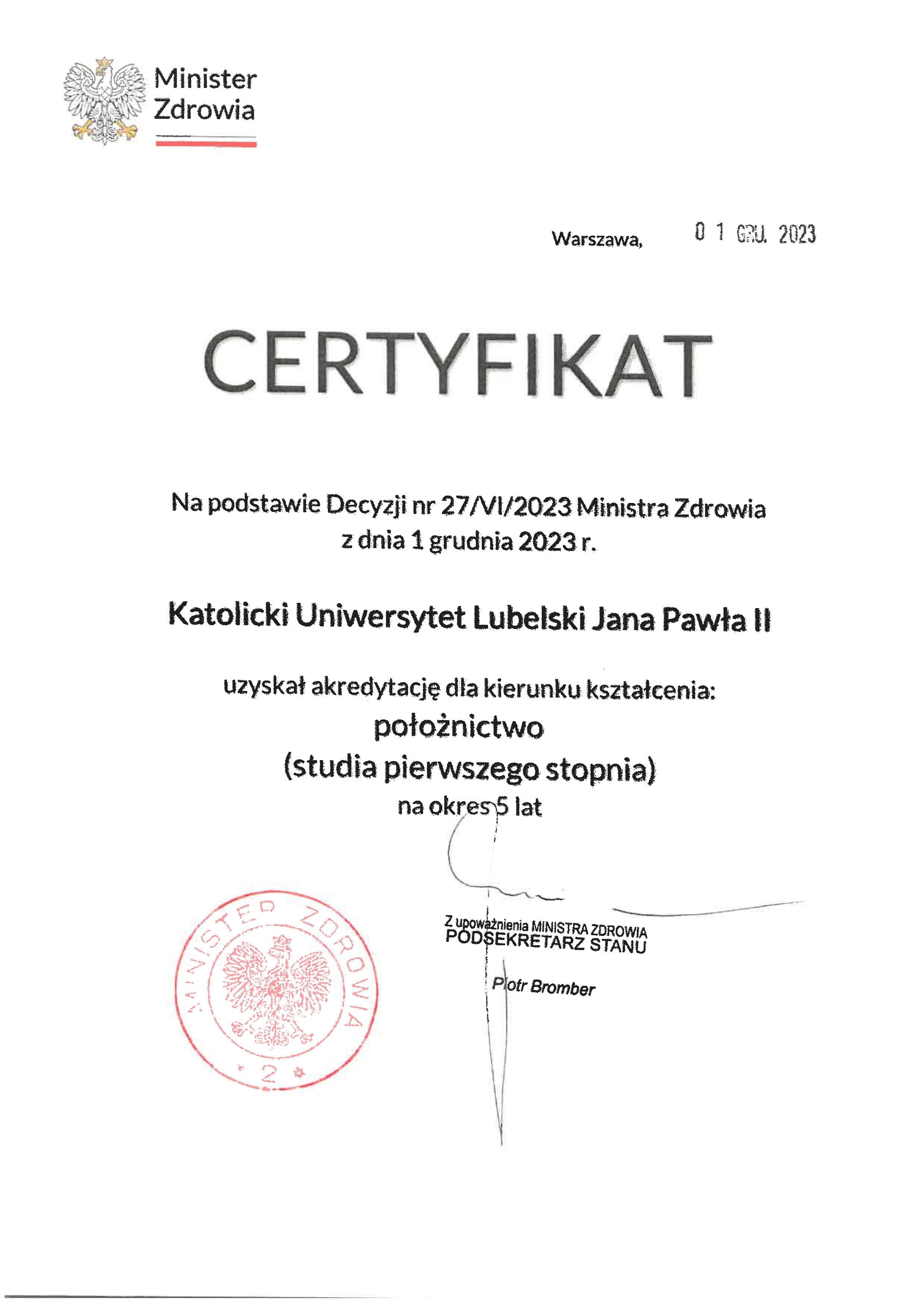 Z satysfakcją informujemy, że Minister Zdrowia Decyzją nr 27/VI/2023 z dnia 1 grudnia 2023 r. udzielił akredytacji dla kierunku położnictwo (studia I stopnia) na okres 5 lat |