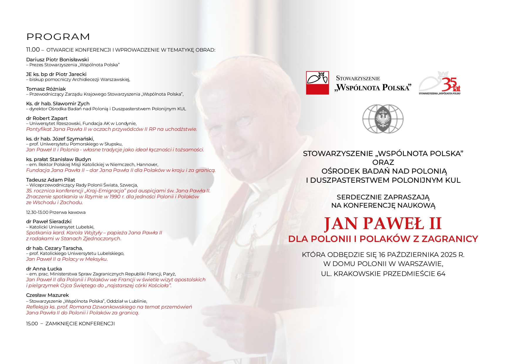 Stowarzyszenie "Wspólnota Polska" oraz Ośrodek Badań nad Polonią i Duszpasterstwem Polonijnym serdecznie zapraszają na konferencję naukową "Jan Paweł II dla Polonii i Polaków za granicą", która odbędzie się 16 października 2025 r. w Domu Polonii w Warszawie (ul. Krakowskie Przedmieście 64). Szczegóły dostępne na plakacie.