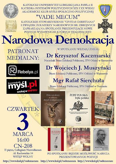 03.03.2011 r. o godzinie 16:00 w sali numer CN 208 Collegium Norwidianum Katolickiego Uniwersytetu Lubelskiego odbyło się spotkanie prezentujące nowe pozycje wydawnicze, których tematem jest "Narodowa Demokracja".