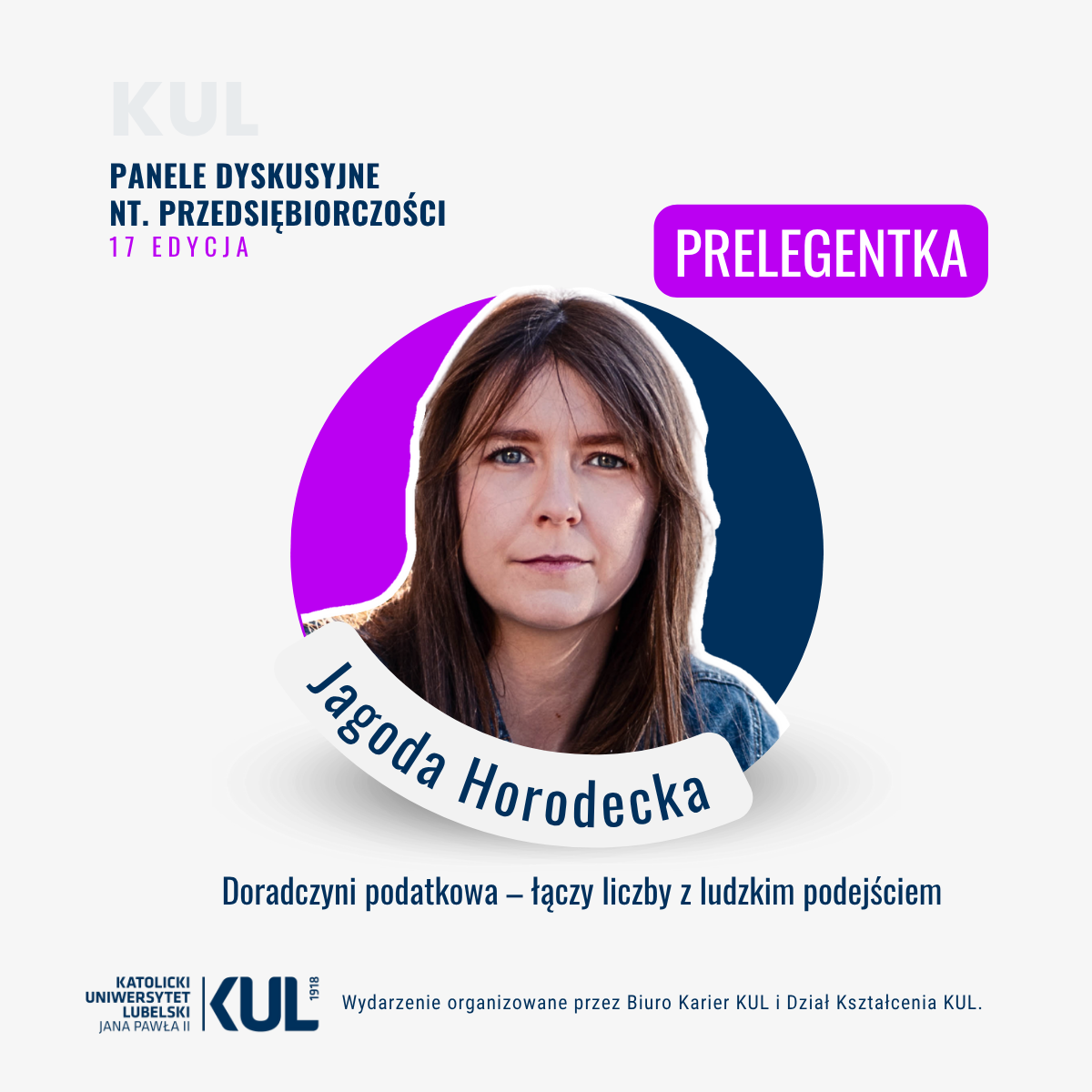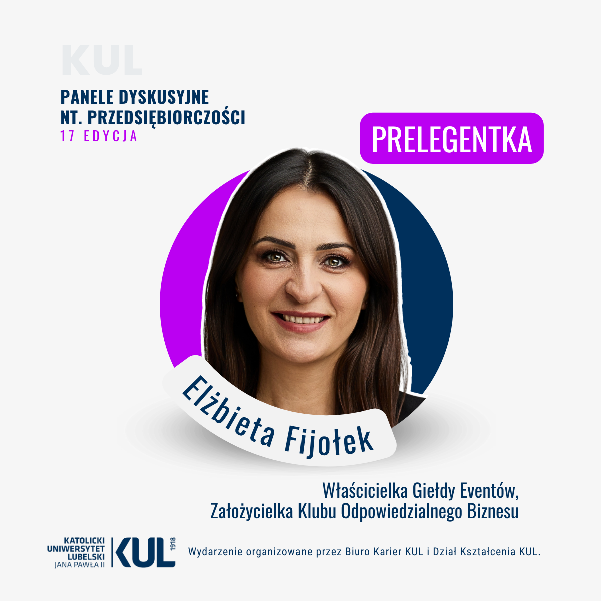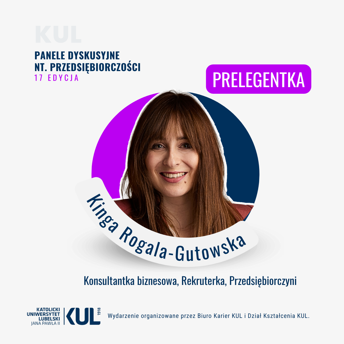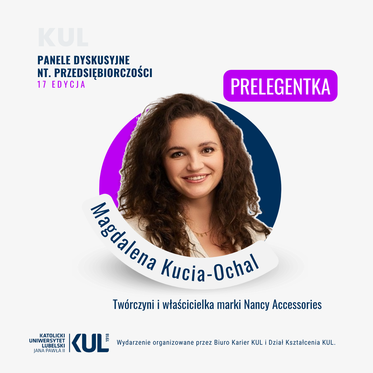 Wydarzenie organizuje Biura Karier KUL, Dział Kształcenia KUL oraz koordynator przedmiotu ogólnouniwersyteckiego „Przedsiębiorczość”, dr Dorota Tokarska.
