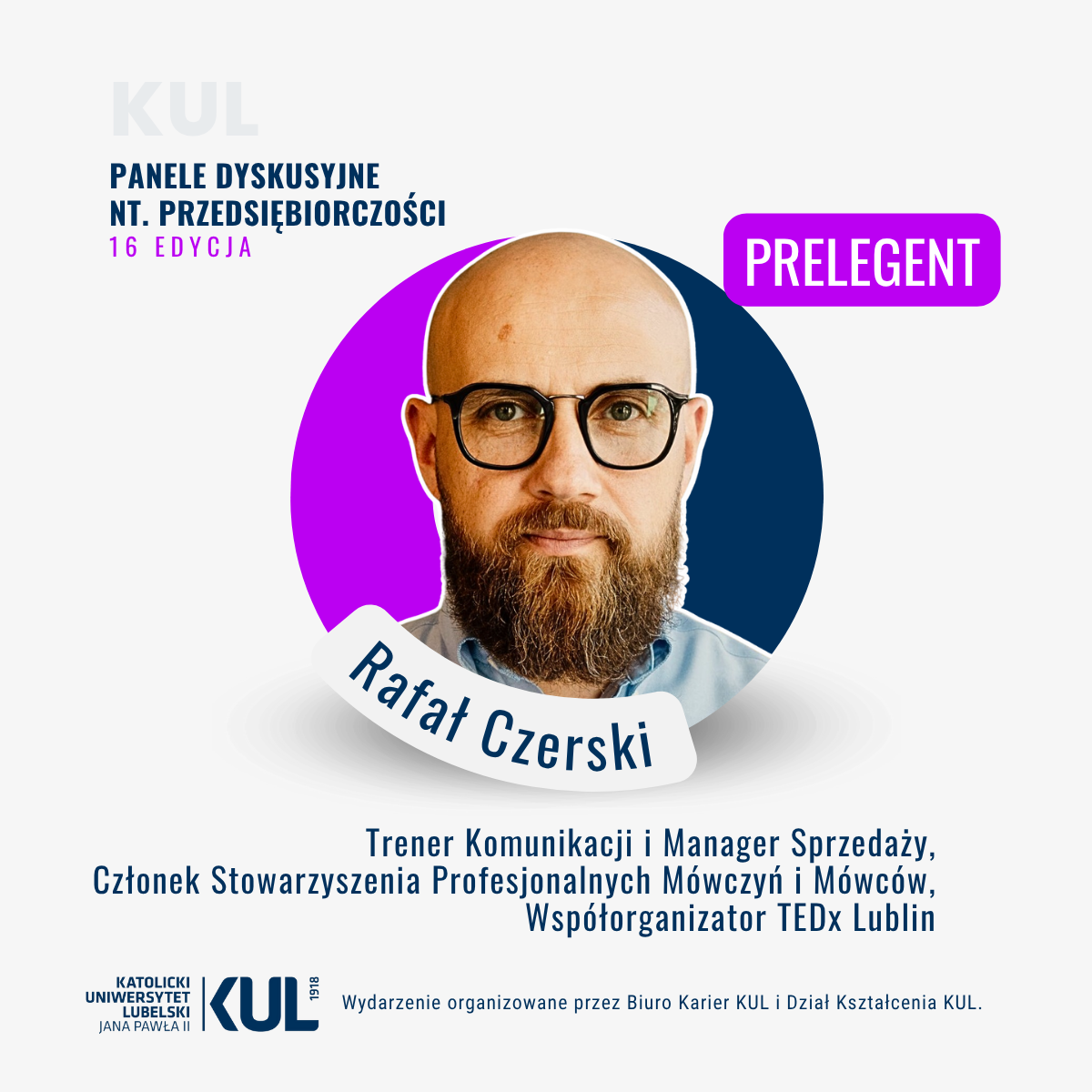 🔵 Rafał Czerski — Absolwent filozofii KUL. Trener komunikacji, praktyk sprzedaży i menedżer, który nie wierzy w teorie oderwane od rzeczywistości. Ukończył filozofię teoretyczną oraz zarządzanie zasobami ludzkimi — połączenie, które pozwala mu patrzeć na problemy z szerokiej perspektywy, a jednocześnie dostrzegać detale decydujące o skuteczności działań. Od ponad 15 lat prowadzi szkolenia z zakresu sprzedaży, komunikacji i umiejętności miękkich. Jako Regionalny Dyrektor Sprzedaży w branży ubezpieczeniowej wie, czym jest codzienna presja wyniku i jak zamieniać strategię w realne efekty. Współtwórca ThinkOut – projektu doradczo-strategicznego, w którym pokazuje firmom, jak budować komunikację sprzedażową i marketingową, która faktycznie działa. Członek Stowarzyszenia Profesjonalnych Mówczyń i Mówców oraz współorganizator TEDxLublin. Łączy logiczne podejście i precyzyjne wyjaśnienia z energią i poczuciem humoru, dzięki czemu jego wystąpienia są merytoryczne i angażujące.
