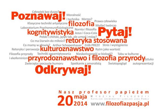 Wydział Filozofii KUL zaprasza wszystkich chętnych 20 maja 2014 r. (wtorek) do Gmachu Głównego KUL przy Al. Racławickich 14 na warsztaty w ramach programu Filozofia z pasjąPytaj! Odkrywaj! Poznawaj! Wykłady i warsztaty są skierowane do uczniów szkół ponadgimnazjalnych, a także dla studentów i wszystkich zainteresowanych naukami filozoficznymi.