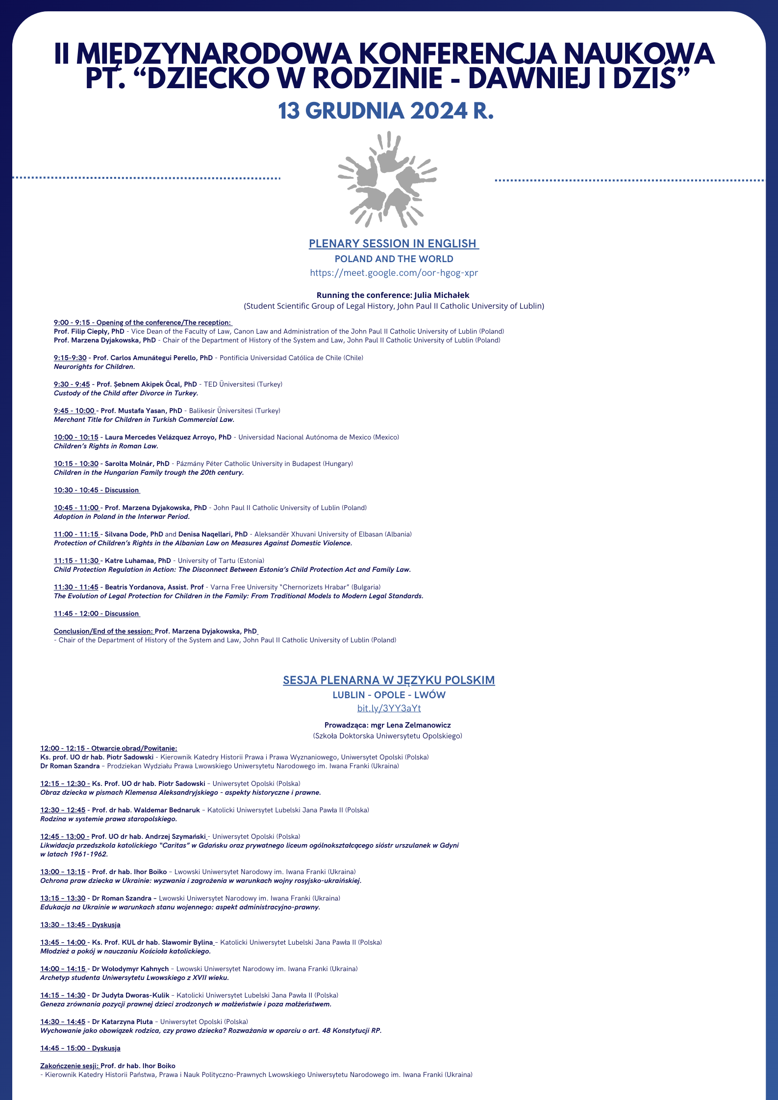 Zapraszamy do udziału w obradach, gdzie w międzynarodowym gronie, będziemy zgłębiać tematy związane z historią i współczesnością praw dziecka oraz ich położeniem w rodzinie. To wyjątkowa okazja, by wymienić doświadczenia i perspektywy z różnych części świata!