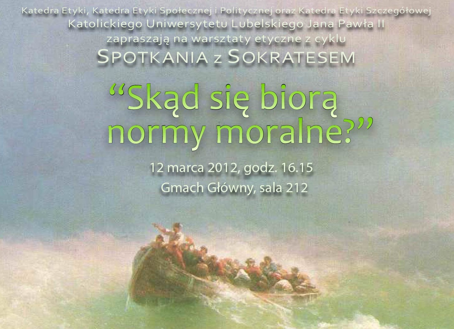 Katedra Etyki KUL zaprasza uczniów szkół ponadgimnazjalnych 12 marca 2012 r. w ramach cyklu Spotkania z Sokratesem na warsztaty etyczne pt. Skąd się biorą normy moralne.
