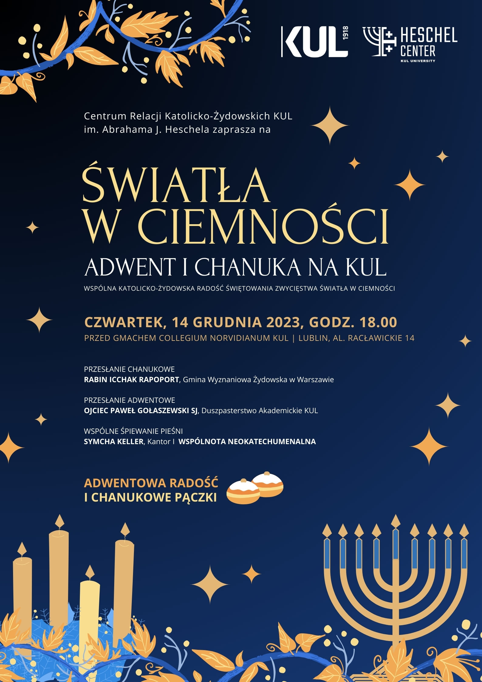 Centrum Relacji Katolicko-Żydowskich KUL im. Abrahama J. Heschela serdecznie zaprasza na wspólne świętowanie Adwentu i Chanuki na Katolickim Uniwersytecie Lubelskim Jana Pawła II. Uroczystość odbędzie się we czwartek, 14 grudnia o godz. 18.00 przed wejściem do Collegium Norwidianum w kampusie głównym KUL przy Alejach Racławickich 14 .