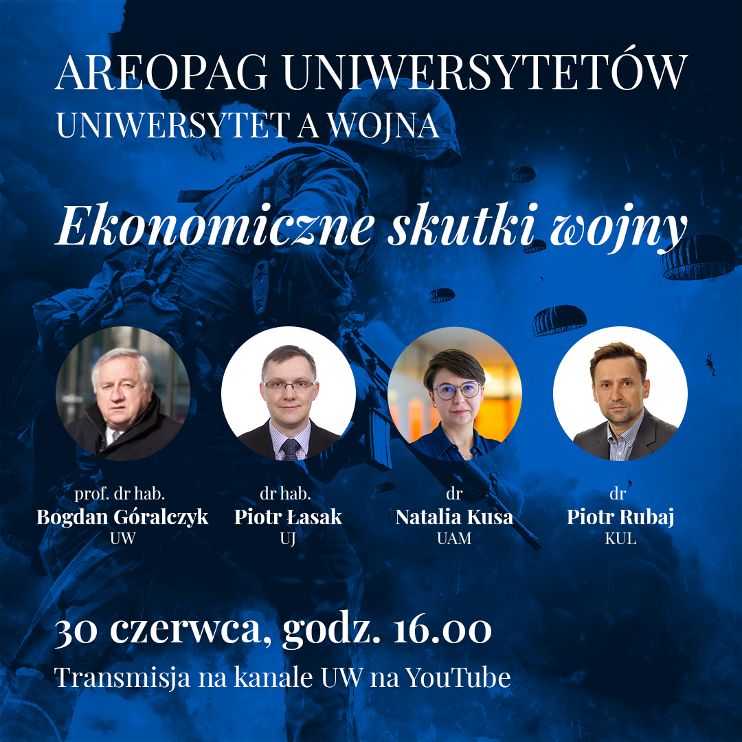 The economic effects of war, including the one resulting from Russia's current aggression against Ukraine, will be the subject of experts debate that will take place on June 30 at the University of Warsaw. The meeting – under the framework of the Areopagus of Universities series initiated by KUL - will be attended by Prof. Bogdan Góralczyk (UW), Dr. Natalia Kusa (UAM), Prof. Piotr Łasak (UJ) and Dr. Piotr Rubaj (KUL).