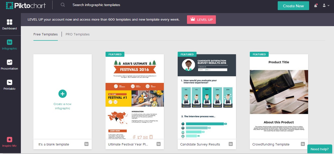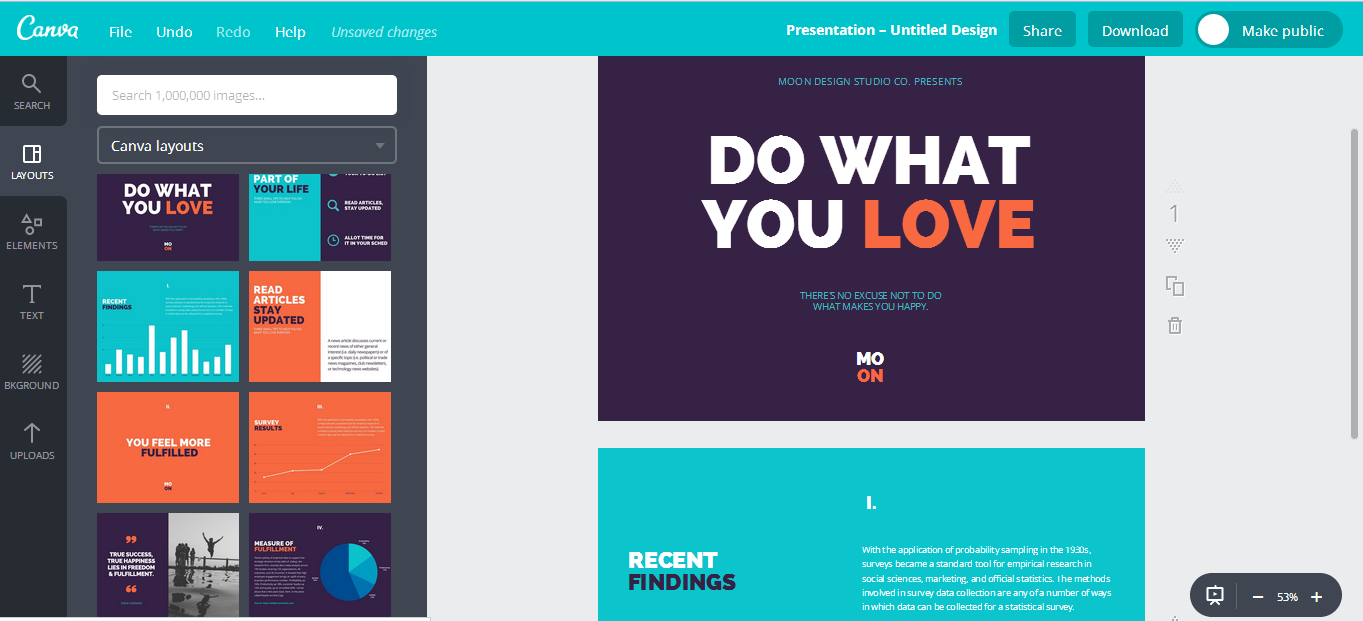 Darmowe i uniwersalne narzędzie popularne do tworzenia infografik, ale też tworzenia prezentacji. Aplikacja ma wiele gotowych szablonów i mnóstwo dodatków. Prezentację możesz pobrać w formacie png i jpg.