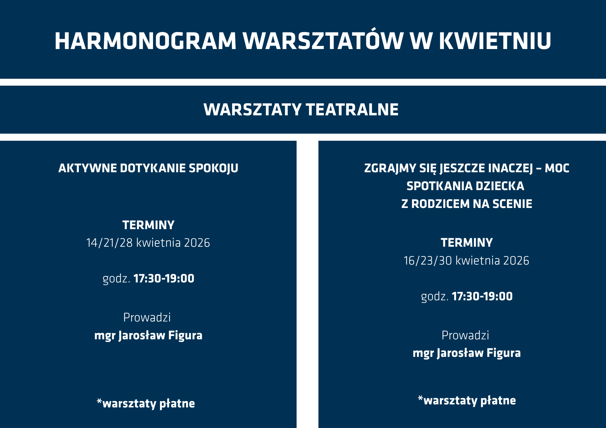 Centrum Wsparcia i Rozwoju KUL oferuje: cykl bezpłatnych warsztatów Studenci dla Studentów prowadzonych przez studentów psychologii KUL oraz płatne warsztaty teatralne i rodzicielskie. Zapisy na warsztaty studenckie odbywają się za pośrednictwem ankiety, natomiast pozostałe za pośrednictwem maila: wsparcie@kul.pl. Poniżej przedstawiamy harmonogram warsztatów w kwietniu.
