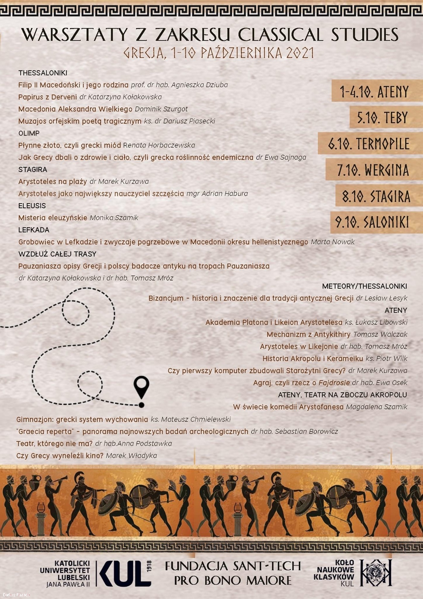 Ubiegły rok, z powodu pandemii, okazał się dla wszystkich trudnym czasem. Również i dla studentów i wykładowców filologii klasycznej, którzy nie tylko musieli zmierzyć się z nową formą studiowania i nauczania zdalnego, ale i dla zamierzonych wcześniej przedsięwzięć, jakim była organizacja warsztatów filologów klasycznych w Grecji. Kiedy czas okazał się łaskawszy zaczęliśmy realizować nasze plany... 1 października rozpoczęliśmy nasze zajęcia w Atenach. Gdzie, jak gdzie, ale właśnie tam, u stóp Akropolu rozpoczęła się nasza grecka marszruta, mająca swoje dopełnienie w Salonikach. Niemalże 10 dni intensywnego chłonięcia starożytności. Spotkaliśmy się z Platonem w jego Akademii, pojechaliśmy do nadmorskiej Stagiry (dziś Olimpiada), aby poznać rodzinne strony Arystotelesa i jemu samemu się pokłonić. Były i misteria eleuzyńskie i grobowiec Filipa Macedońskiego w Lefkadzie i Termopilskie Wzgórze i Meteory i wiele innych jeszcze przeciekawych miejsc, zdarzeń, informacji... Tego po prostu trzeba doświadczyć! Tam po prostu trzeba pojechać! Zapraszamy na kolejny wyjazd!