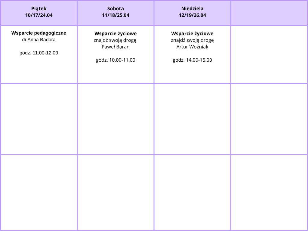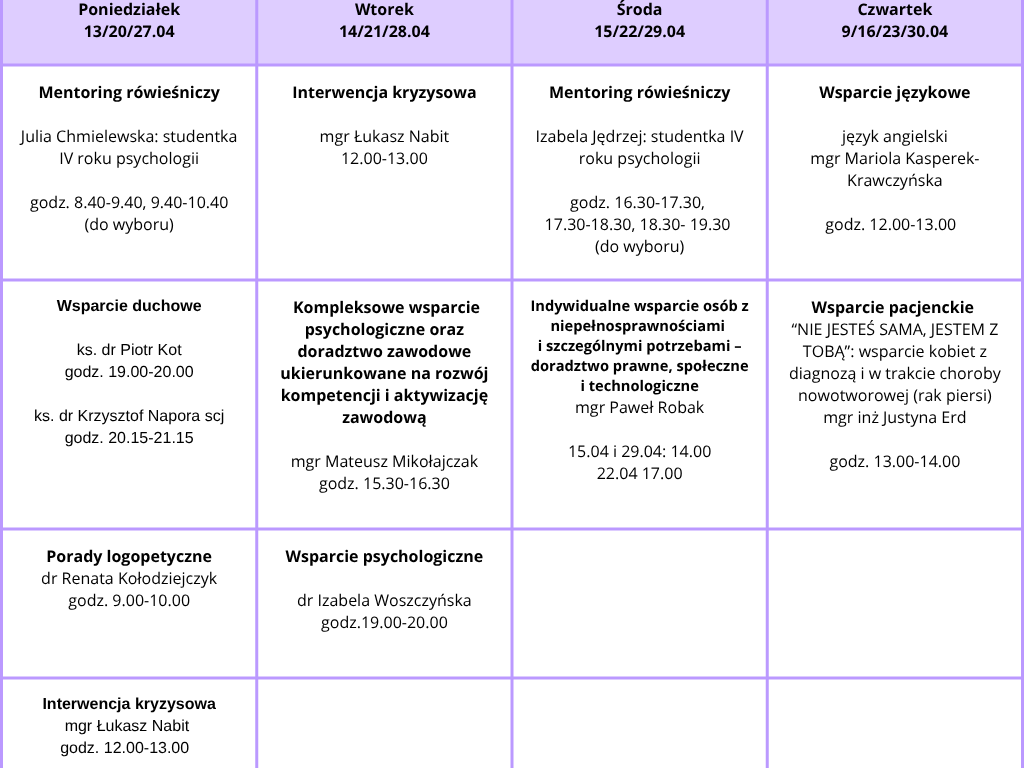 Harmonogram konsultacji w ramach Centrum Wsparcia i Rozwoju KUL w kwietniu