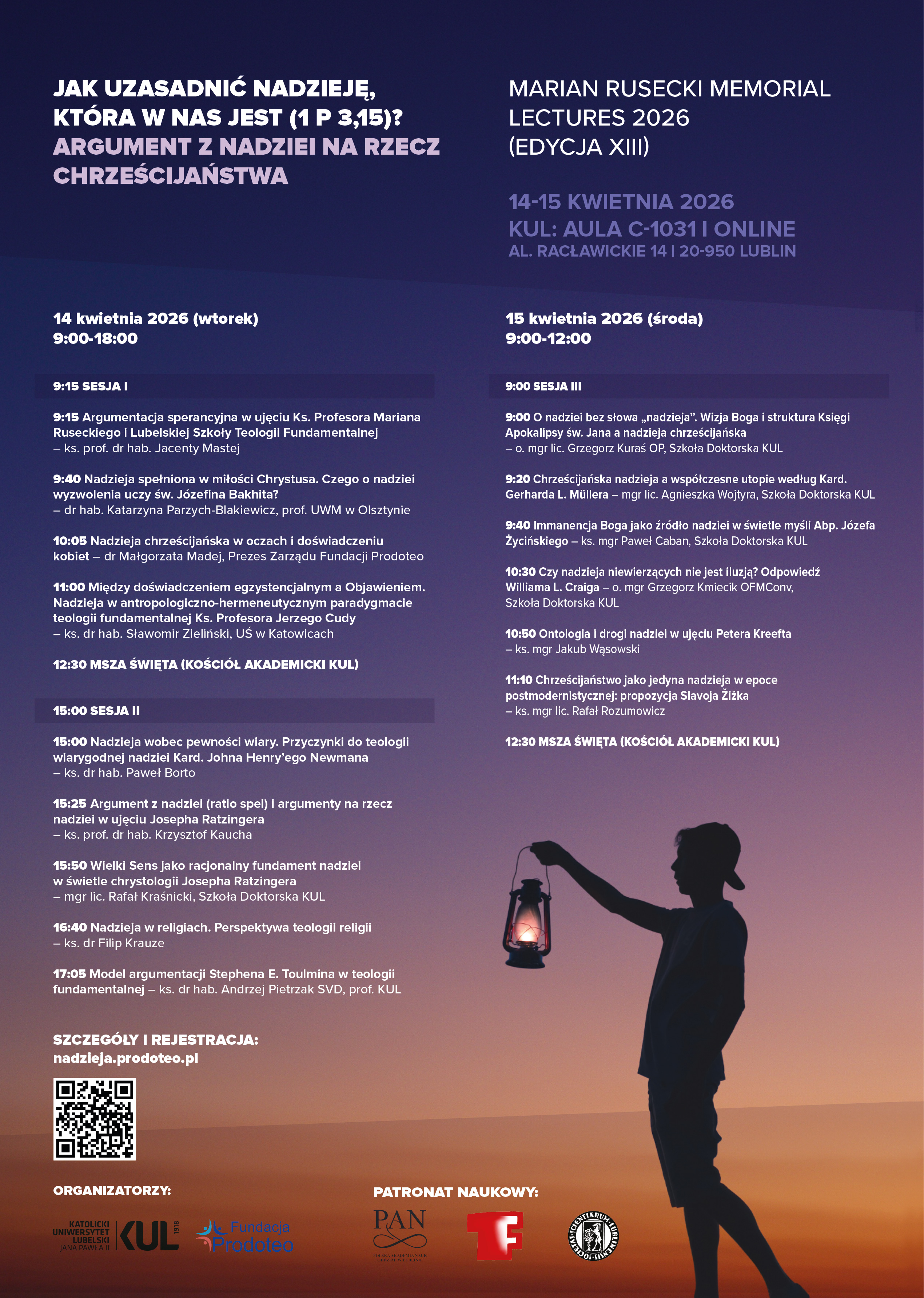 Sekcja Teologii Fundamentalnej KUL i Fundacja Prodoteo serdecznie zapraszają na XIII edycję Marian Rusecki Memorial Lectures, które odbędą się 14 i 15 kwietnia 2026 r. na Katolickim Uniwersytecie Lubelskim Jana Pawła II. W tym roku skupimy się na uzasadnianiu nadziei chrześcijańskiej. Program obejmuje liczne referaty analizujące myśl wybitnych naukowców, jak kard. Joseph Ratzinger, kard. John Henry Newman, ks. Marian Rusecki, ks. Jerzy Cuda, kard. Gerhard Müller, abp Józef Życiński, William Craig i Peter Kreeft. Swoistym novum będzie prezentacja świadectwa nadziei w życiu św. Józefiny Bakhity oraz podjęcie refleksji nad nadzieją chrześcijańską w oczach i doświadczeniu kobiet. Całość zwieńczą panele dyskusyjne z udziałem zaproszonych Prelegentów, Wykładowców Sekcji Teologii Fundamentalnej KUL oraz Doktorantów ze Szkoły Doktorskiej KUL.